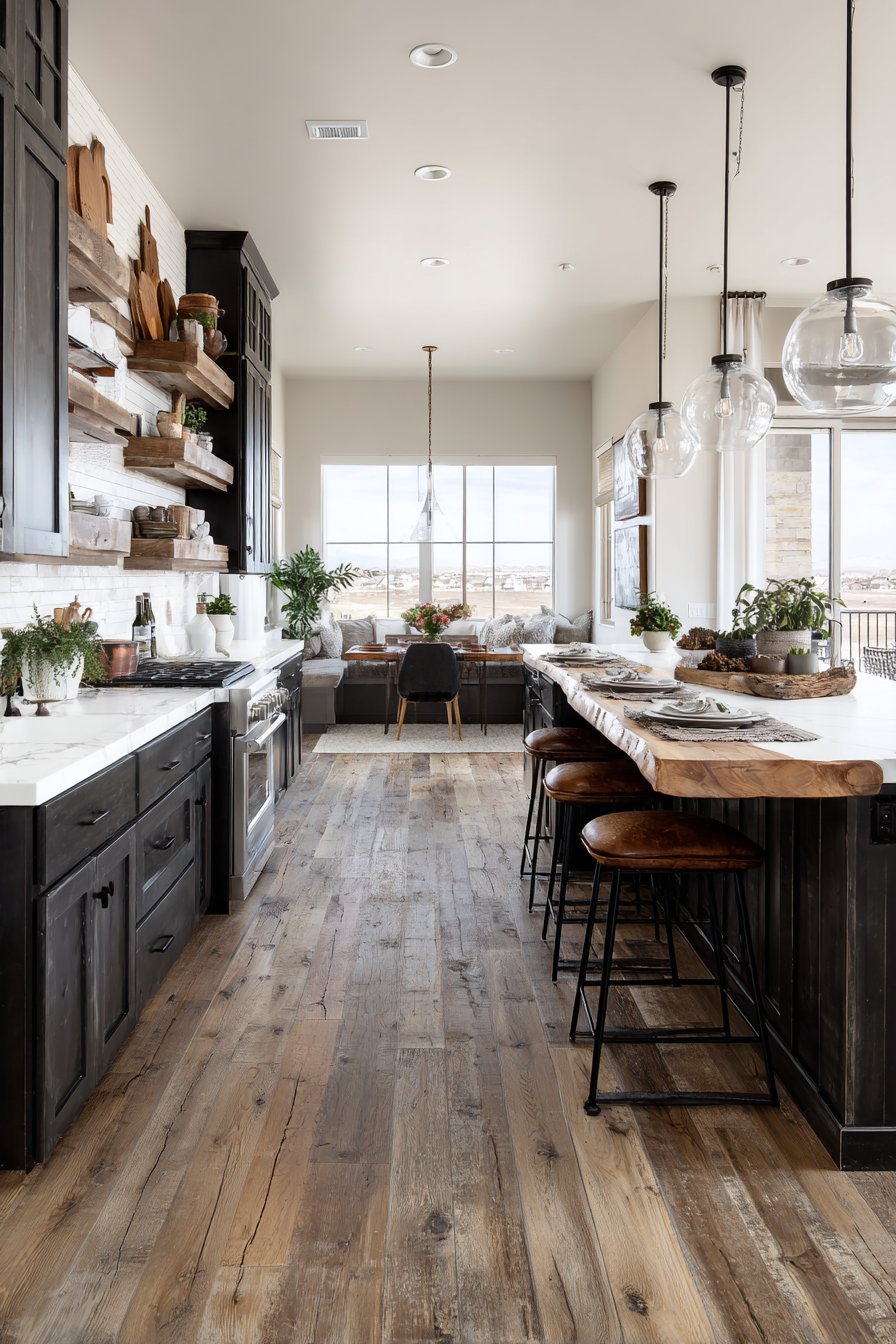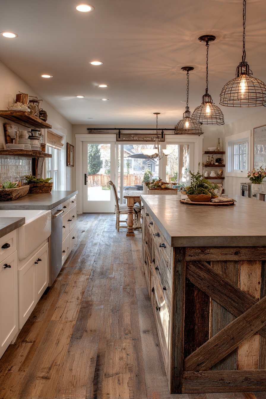 Natural light from multiple windows creates warm golden hour ambiance. The lighting enhances the lived-in charm of reclaimed materials. This design celebrates imperfection and authentic character. Every element contributes to the welcoming farmhouse aesthetic.