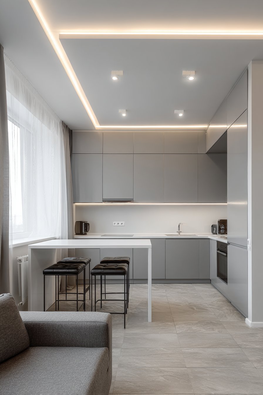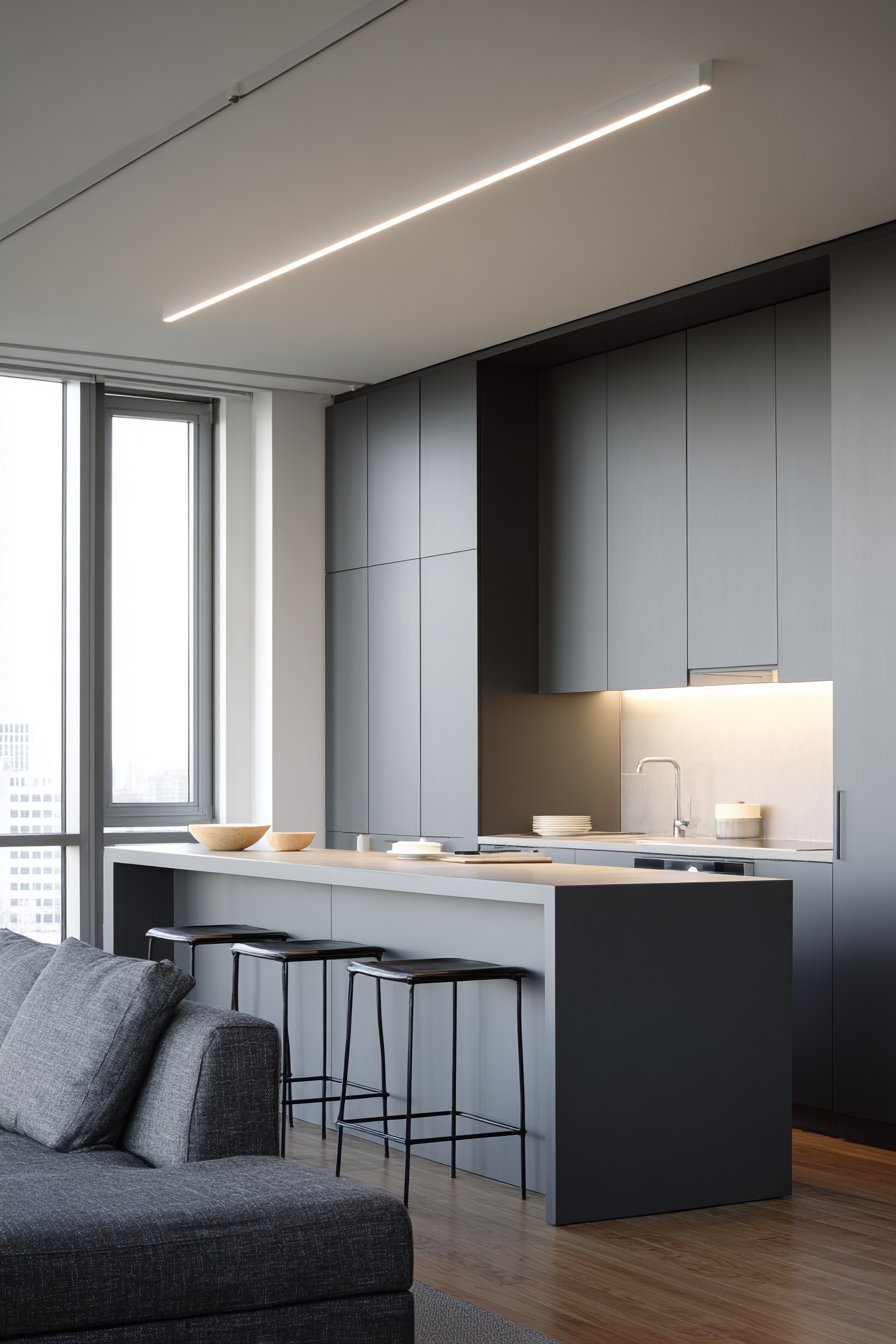 The kitchen opens to a modern living area beyond. Low-profile furniture and abstract art define the contemporary zone. Large format grey porcelain tiles with concrete look flow seamlessly. Minimal recessed lighting and linear LED strips provide clean illumination.