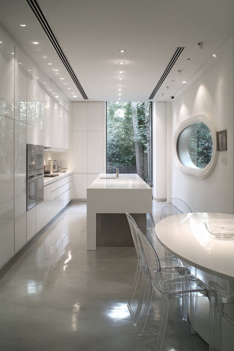 Full-height integrated refrigerator maintains seamless cabinet surfaces. All appliances disappear into the contemporary design aesthetic. The kitchen opens to a sleek dining area beyond. A glass table and molded white chairs continue modern theme.