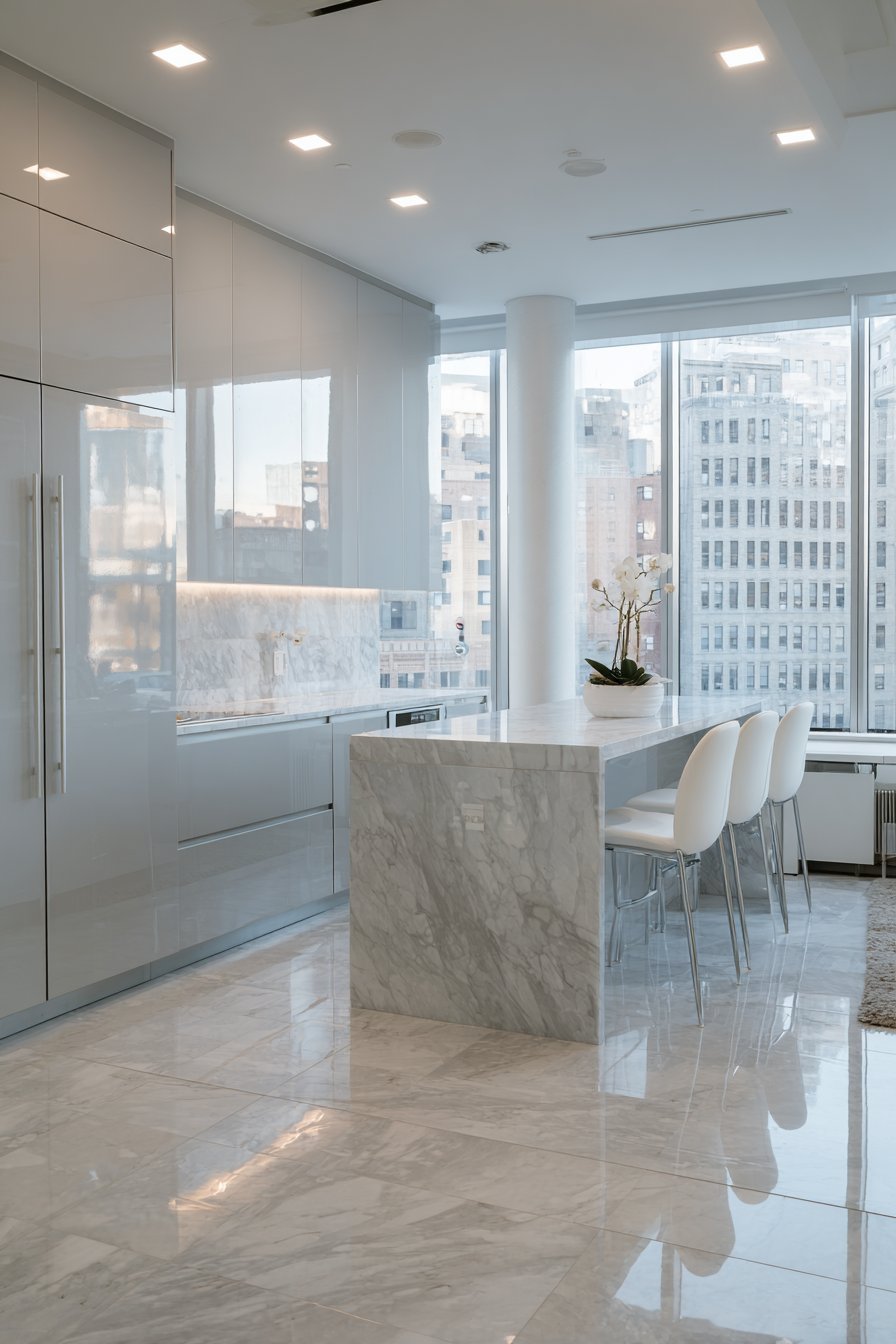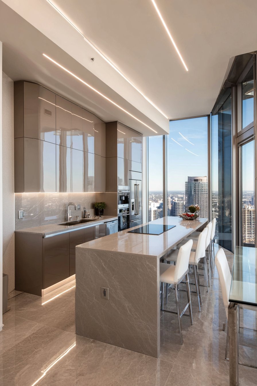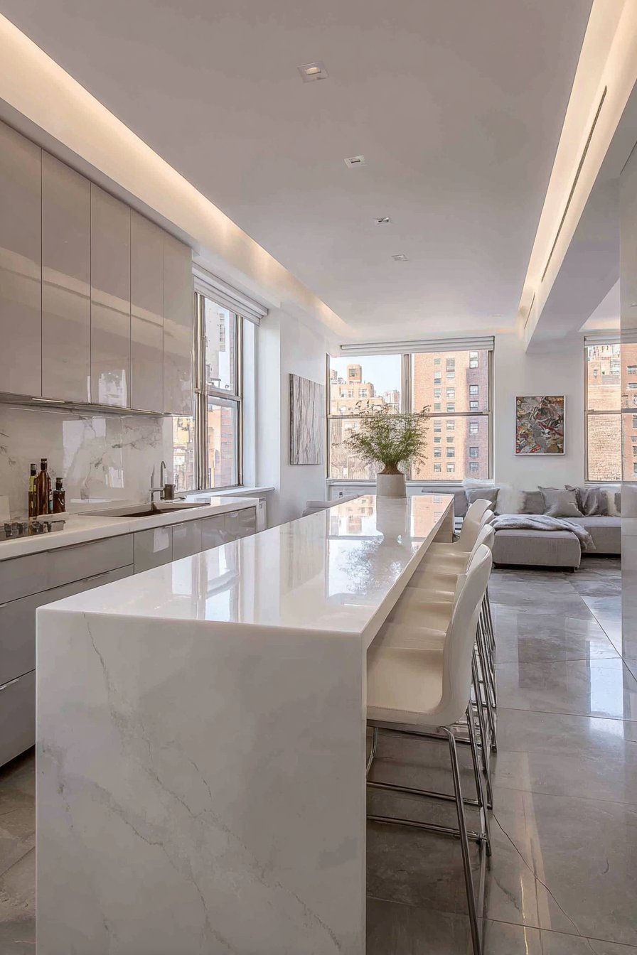 Large format polished porcelain tiles feature subtle marble veining. Linear recessed lighting creates precise, shadow-free illumination. Floor-to-ceiling windows with automated blinds provide abundant light control. Technology integrates seamlessly within the open-concept layout.