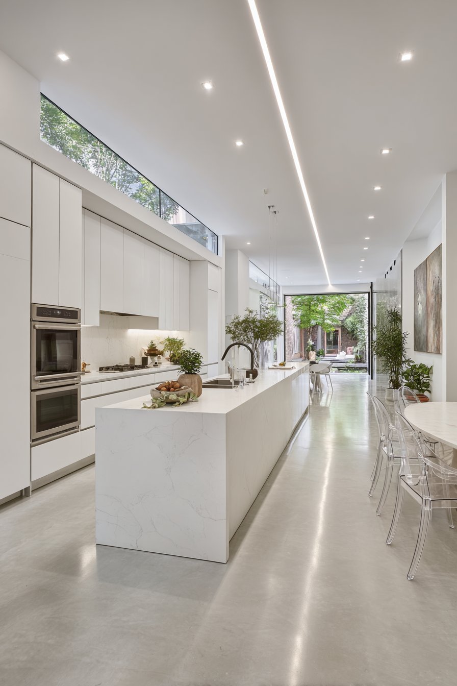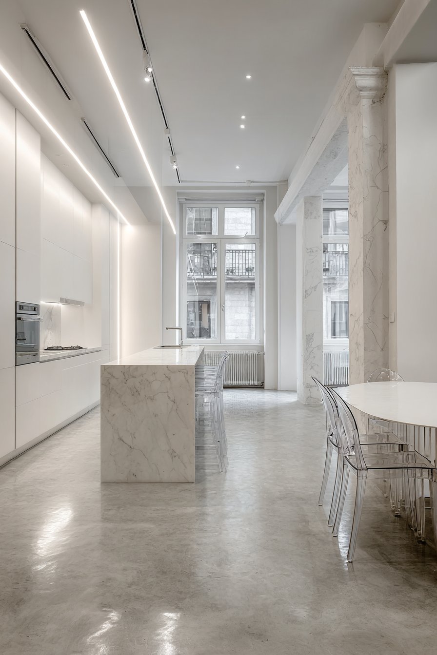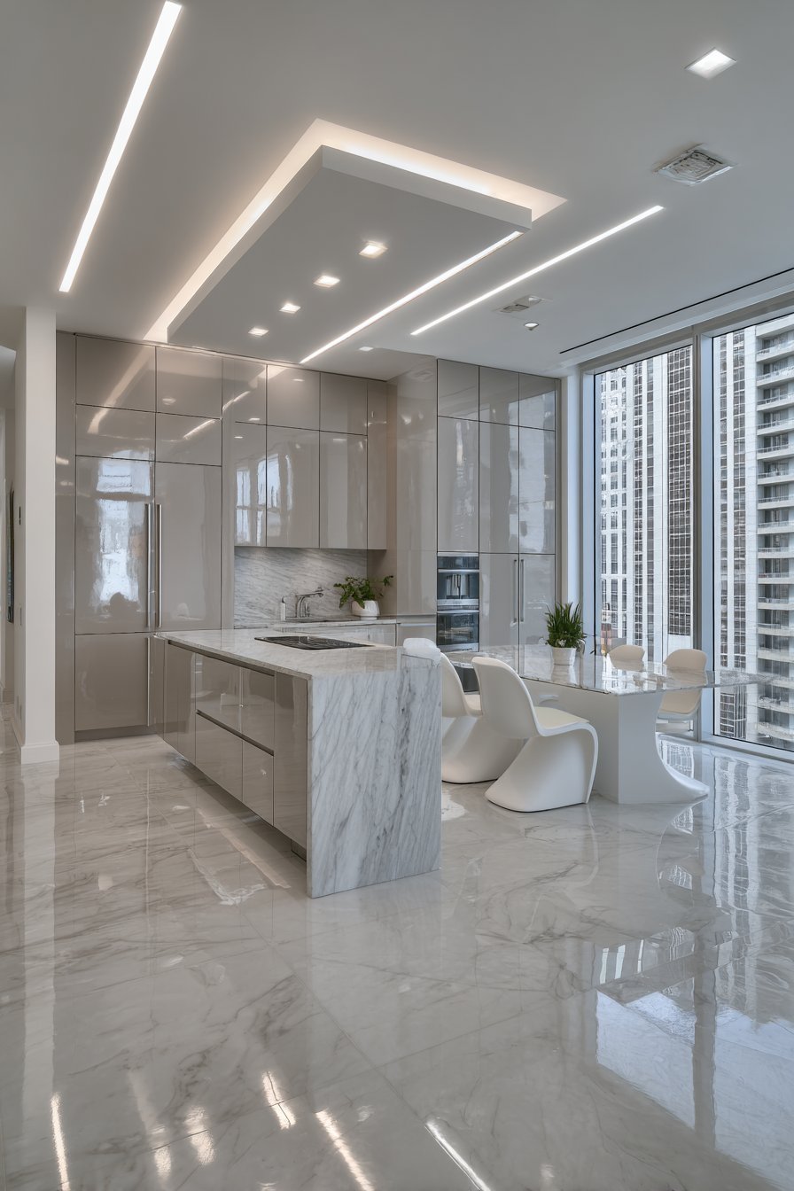 Large format polished porcelain tiles feature subtle marble veining. Linear recessed lighting creates precise, shadow-free illumination. Floor-to-ceiling windows with automated blinds provide abundant light control. Technology integrates seamlessly within the open-concept layout.