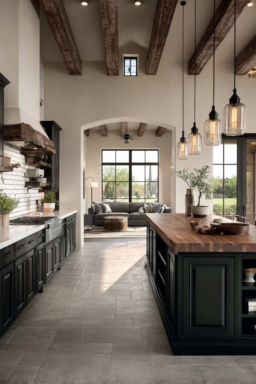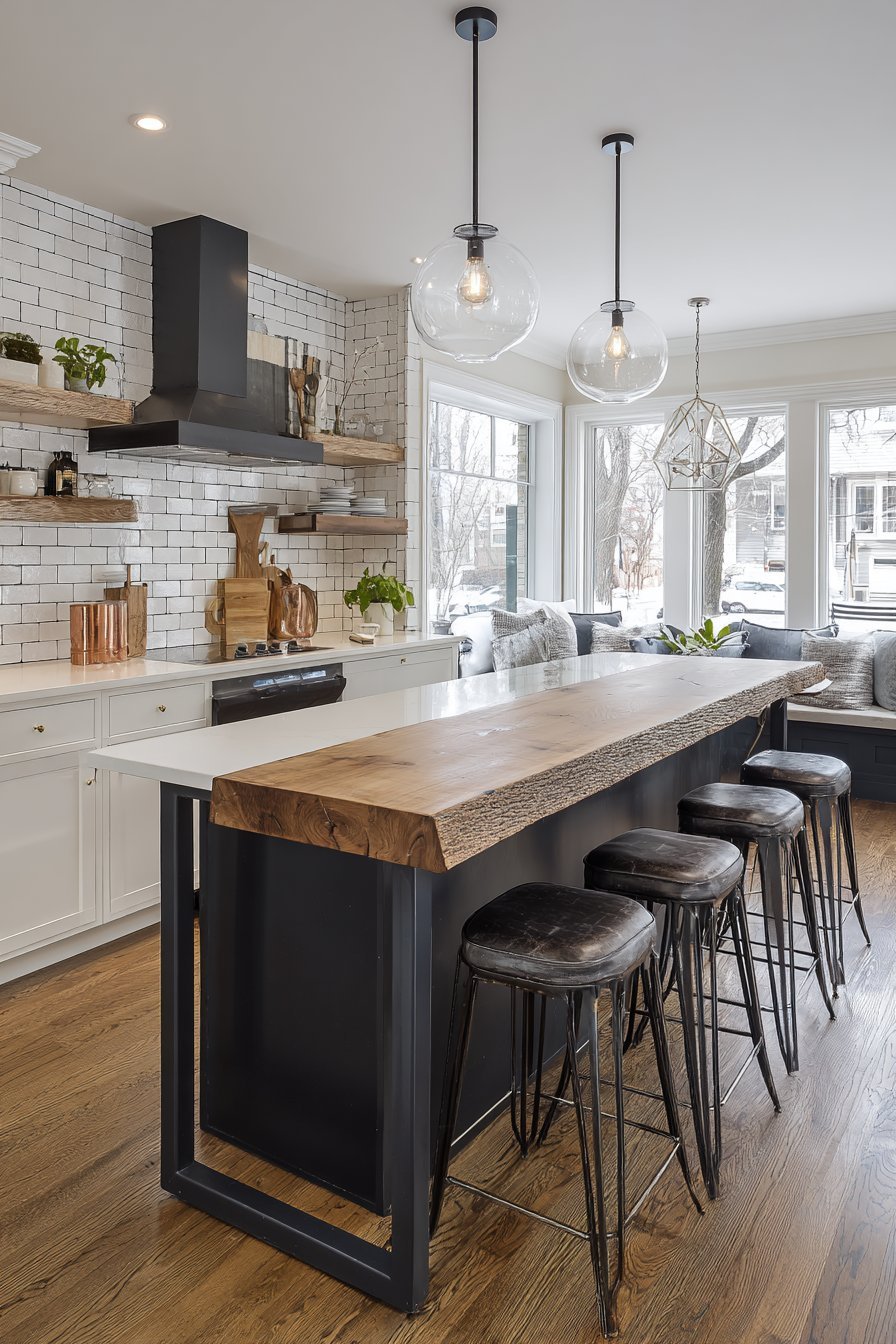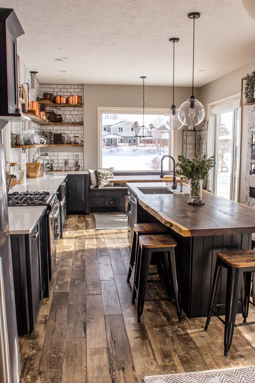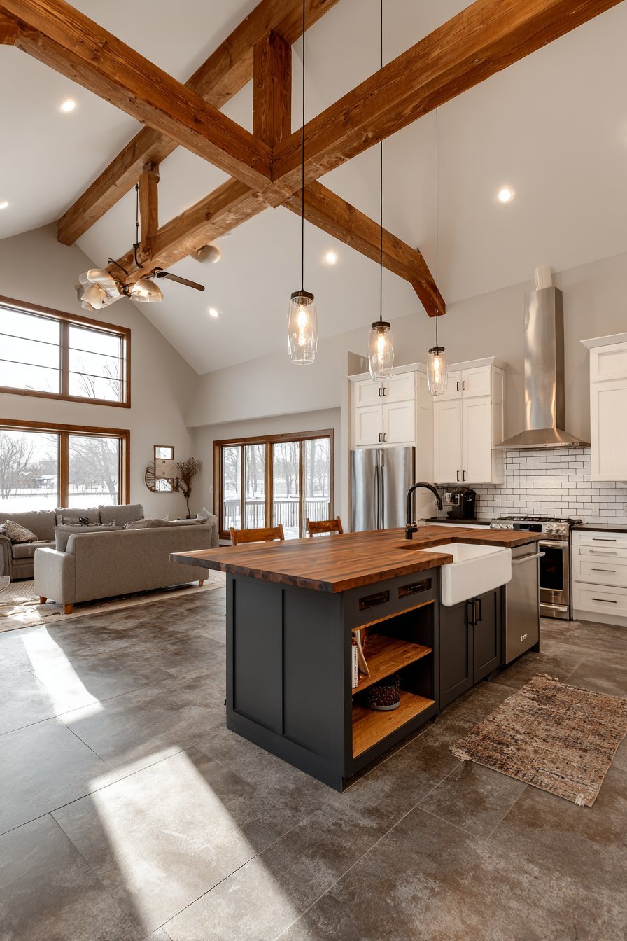 The central prep island features butcher block countertop warmth. Deep charcoal paint colors the base with dramatic contrast. Open storage shelving beneath keeps essentials accessible. White subway tiles create a timeless backsplash that never goes out of style.