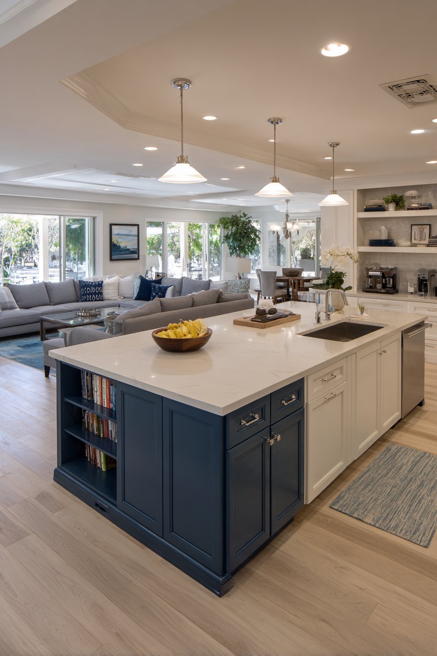 Recessed lighting provides overall ambient illumination throughout. Under-cabinet LED strips create task lighting for meal preparation. The kitchen flows seamlessly into a family room beyond. Comfortable seating and built-in shelving define the adjacent space.