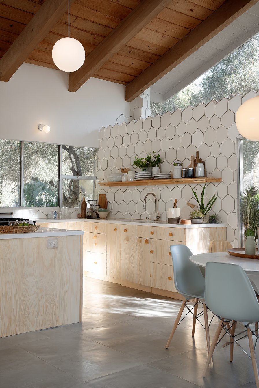 White hexagonal tile backsplash provides geometric interest. The pattern adds visual texture without overwhelming the space. White quartz countertops maintain the bright, airy feeling. Open upper shelving in light wood displays minimal white dishes.