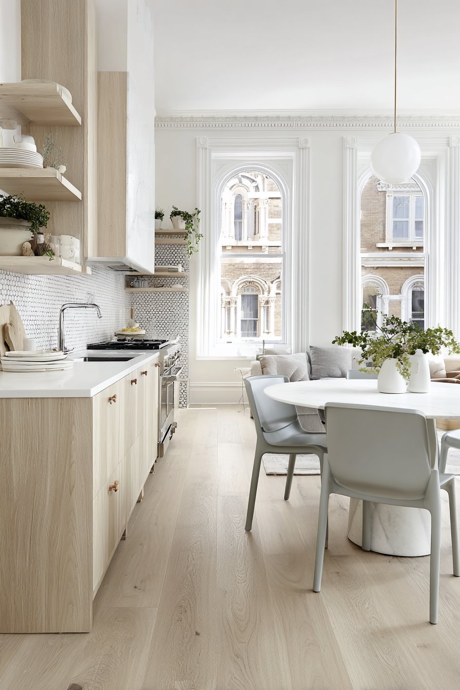 Wide-plank light oak flooring unifies both functional zones. The natural wood grain adds warmth to contemporary finishes. Afternoon light emphasizes material quality and spatial depth. This design demonstrates how thoughtful planning creates multi-functional spaces.