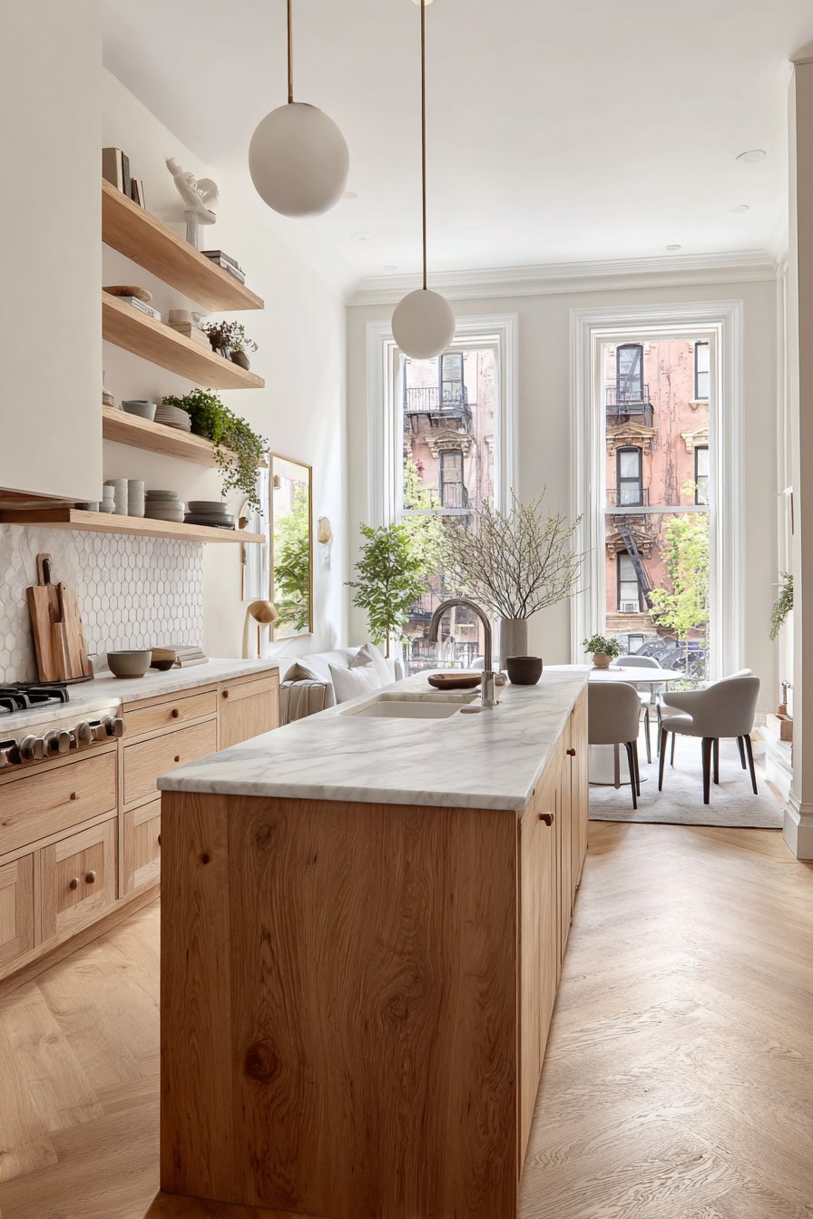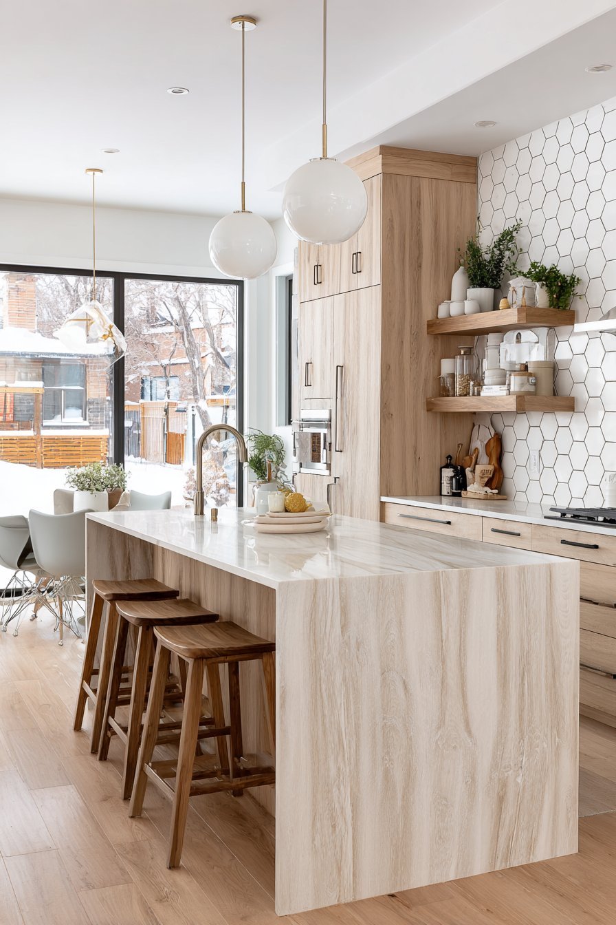 Scandinavian-inspired design features light ash wood cabinets. Simple round wooden knobs maintain minimalist hardware aesthetic. A matching wood waterfall island creates cohesive material palette. The light wood tones create characteristic Nordic brightness.
