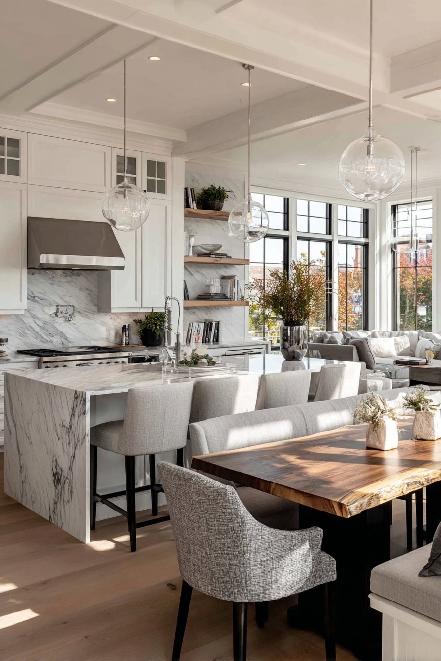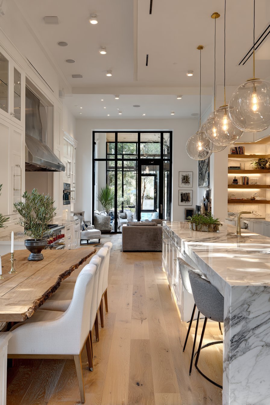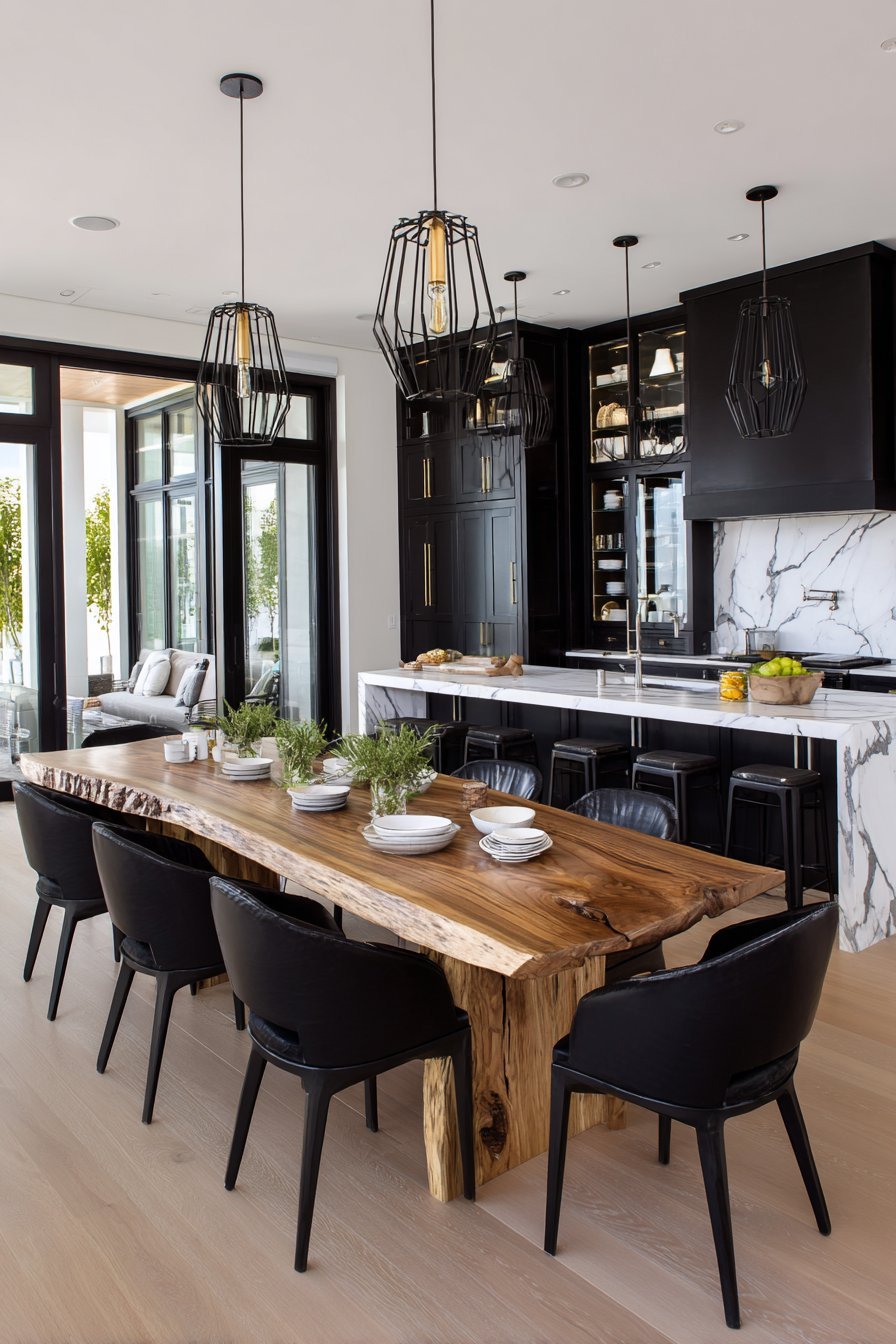 The kitchen opens to a dining area with live-edge wood table. The natural wood element provides warmth to monochromatic scheme. Large format white porcelain tiles with matte finish flow throughout. Modern geometric pendant lights in black and brass hang above the island.