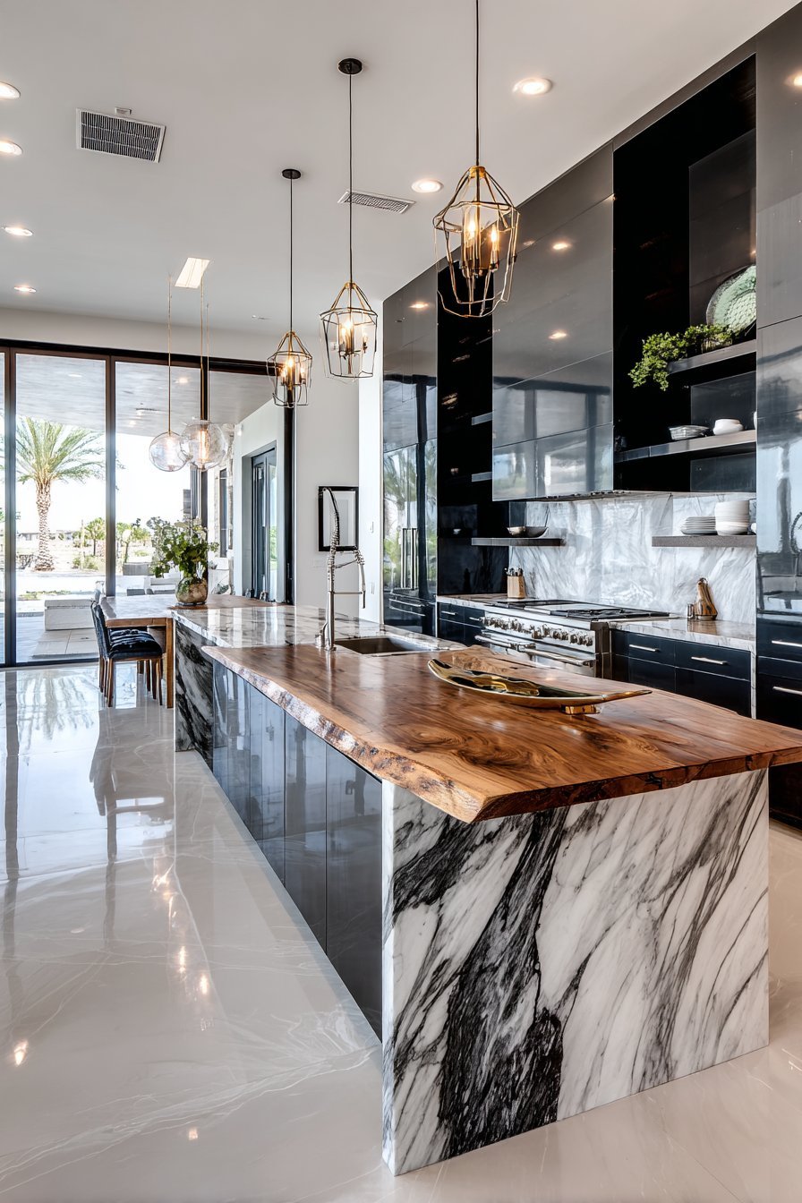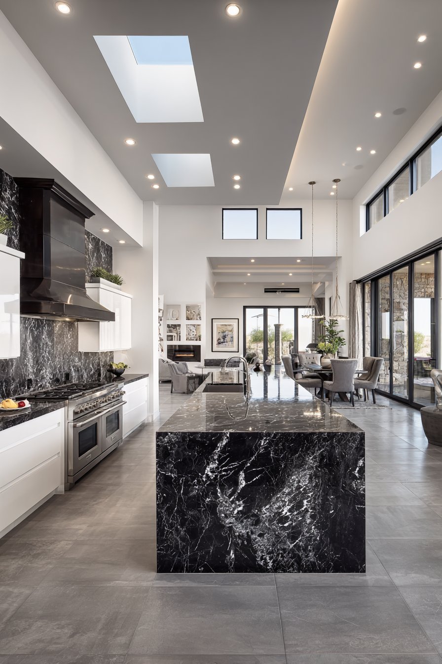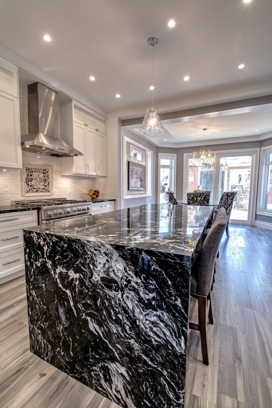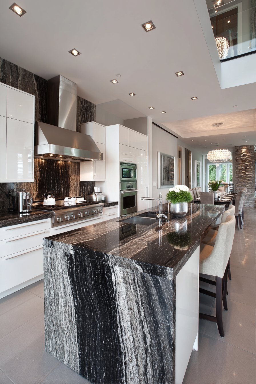 Glossy white lacquered cabinets create contemporary sophistication. A massive waterfall island in black granite commands attention. Dramatic white veining cuts through the dark stone beautifully. Integrated appliances maintain clean, uninterrupted lines throughout.