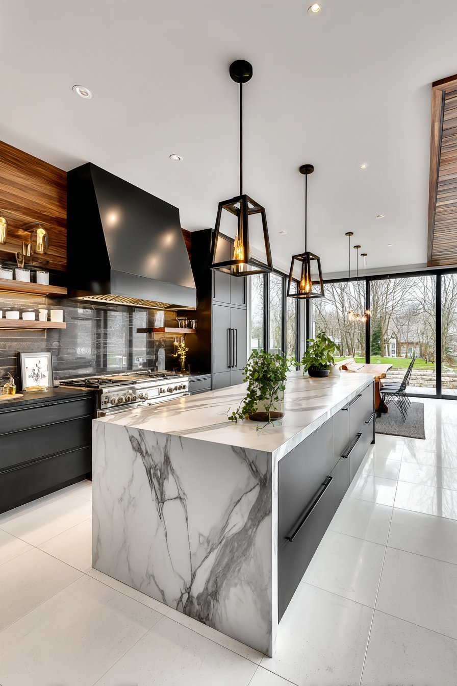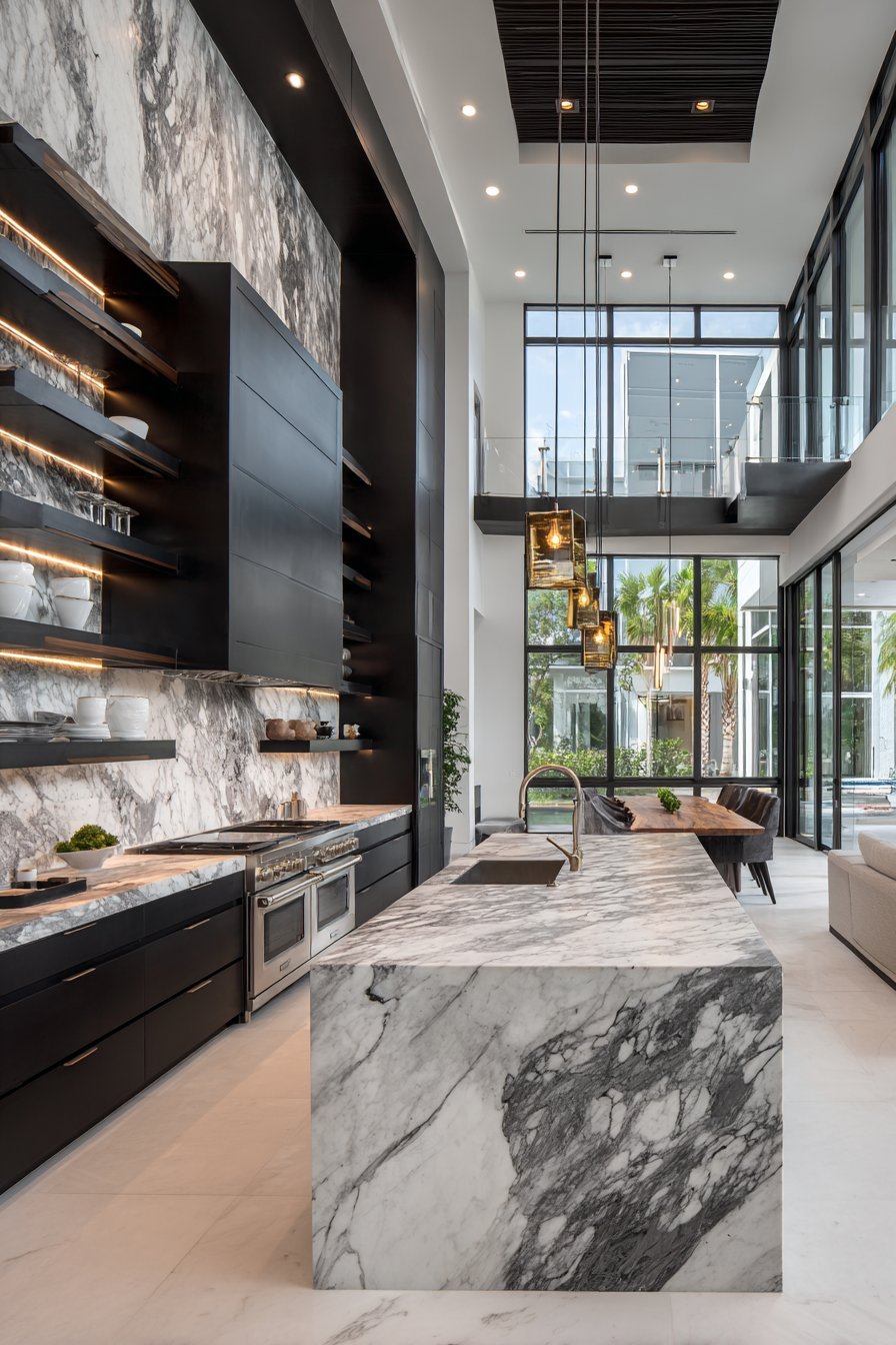 A dramatic black and white color scheme creates striking impact. A massive island topped in white marble features bold grey veining. The stone pattern creates natural artwork throughout the space. Lower cabinets in matte black provide dramatic foundation.