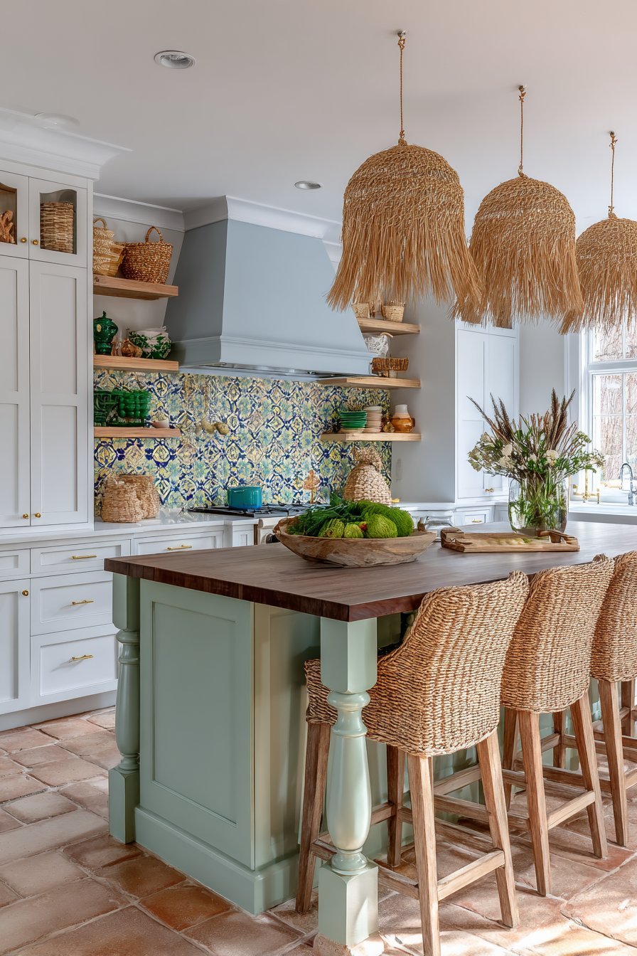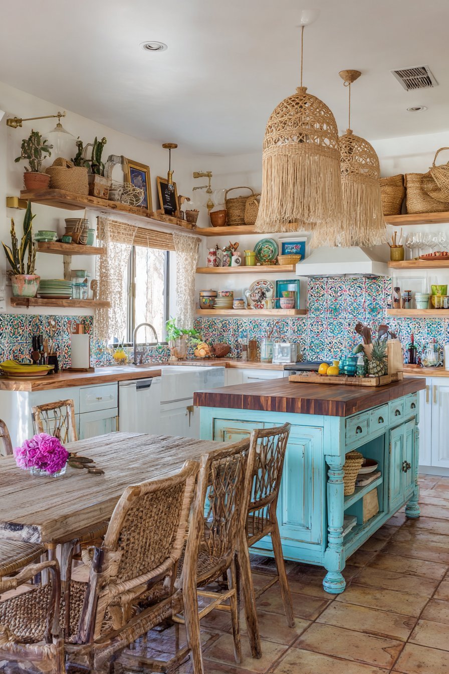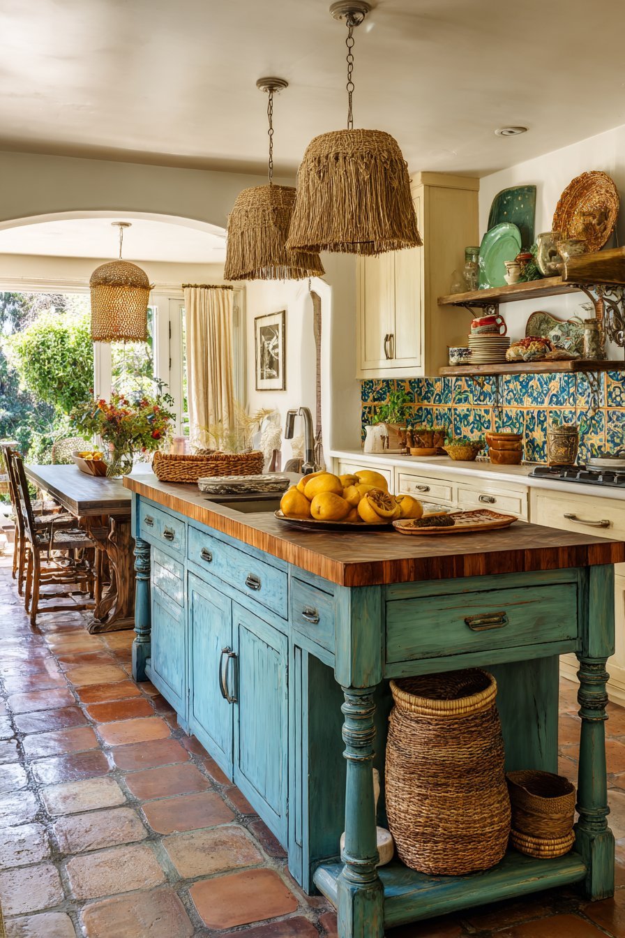 Bohemian style celebrates collected, layered aesthetics. A vintage wooden island with turned legs gets weathered turquoise paint. Walnut butcher block top adds natural warmth and function. The combination creates unique, one-of-a-kind character.