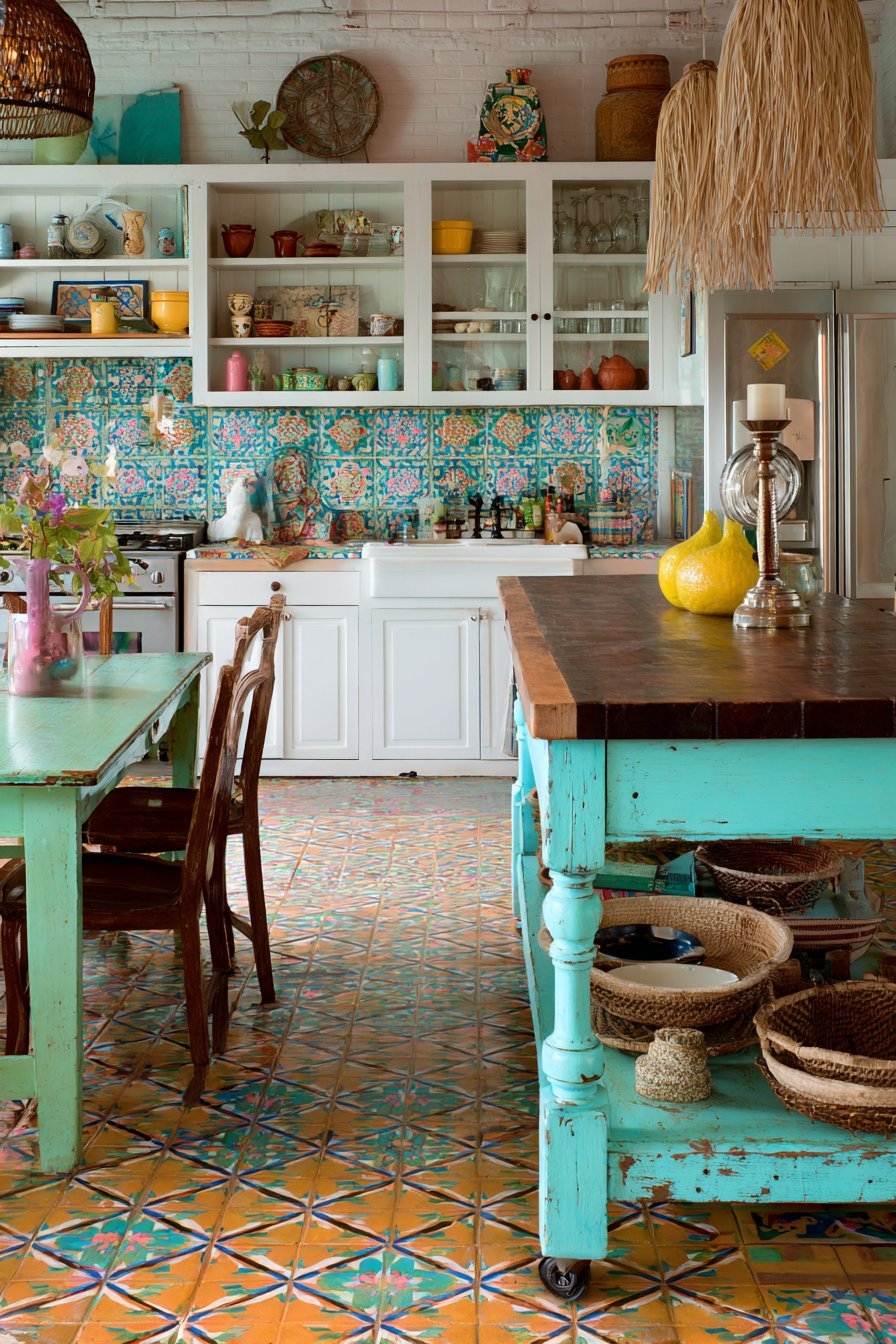 Patterned cement tile backsplash in blues, greens, and coral creates artistic focal point. The colors and patterns feel vibrant and joyful. The kitchen flows into a dining area with rustic table. Mismatched vintage chairs continue the eclectic aesthetic.