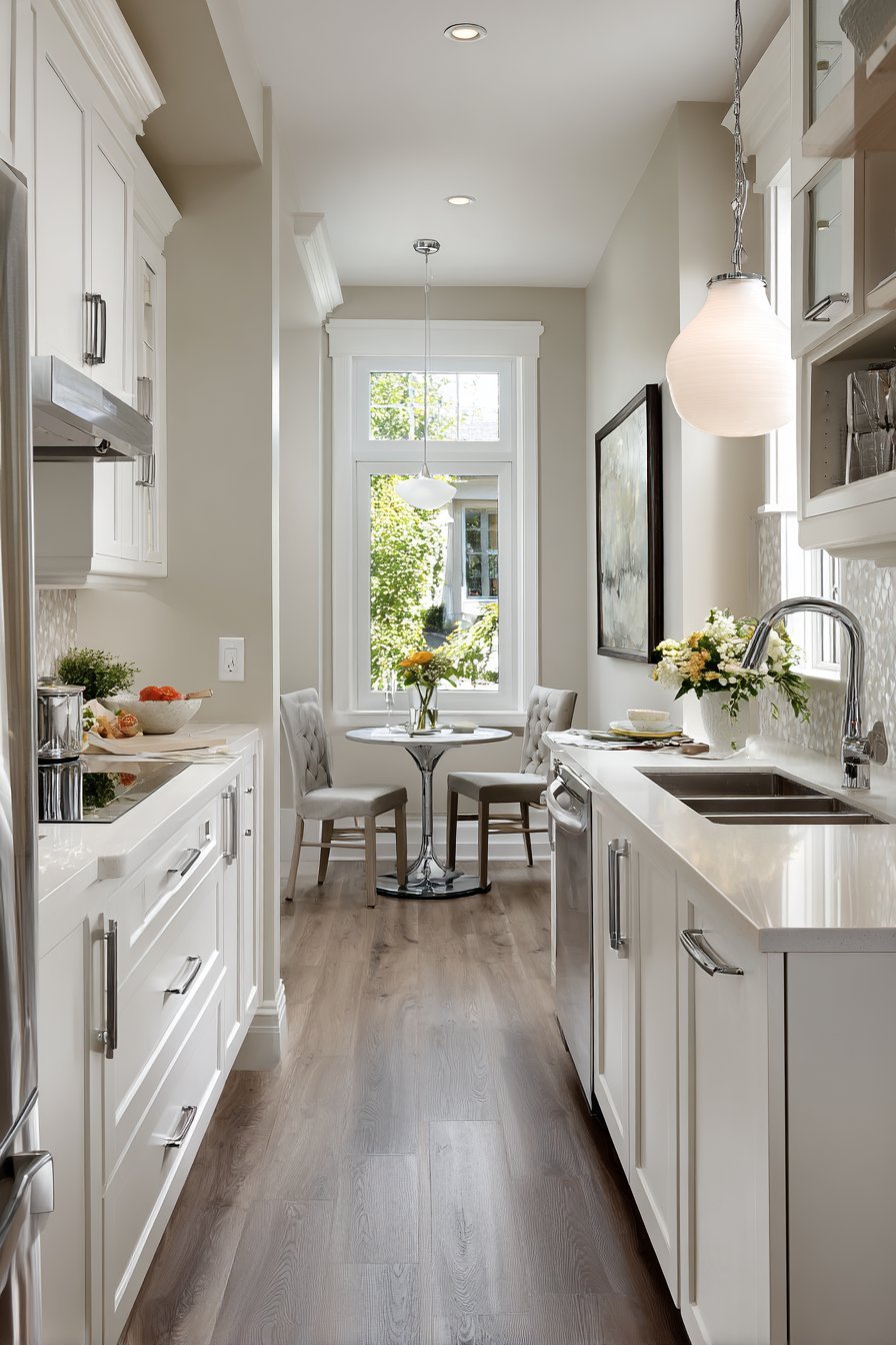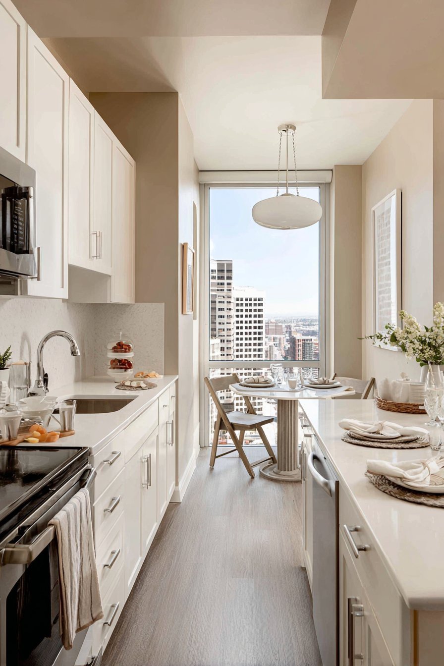 Natural light from a window above the sink and dining window creates openness. The airy feeling defies the compact footprint limitations. Clever design makes small spaces feel spacious and highly functional. This layout proves size doesn’t determine style or usability.