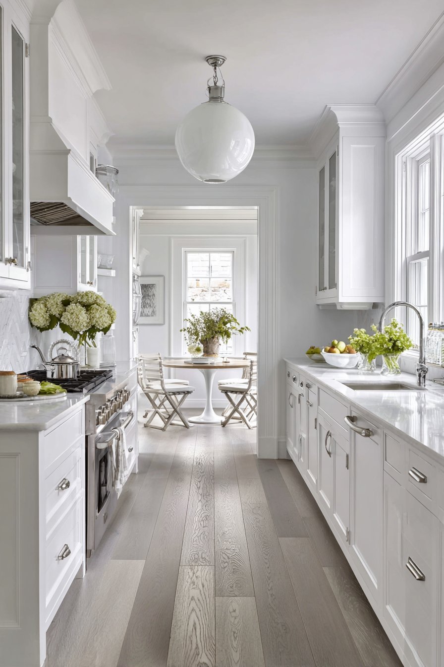 Pure Scandinavian aesthetics define this bright, airy kitchen space. Handleless white cabinets feature push-to-open mechanisms for seamless surfaces. Light wood accents provide natural warmth throughout. The design embodies Nordic principles of simplicity and functionality.