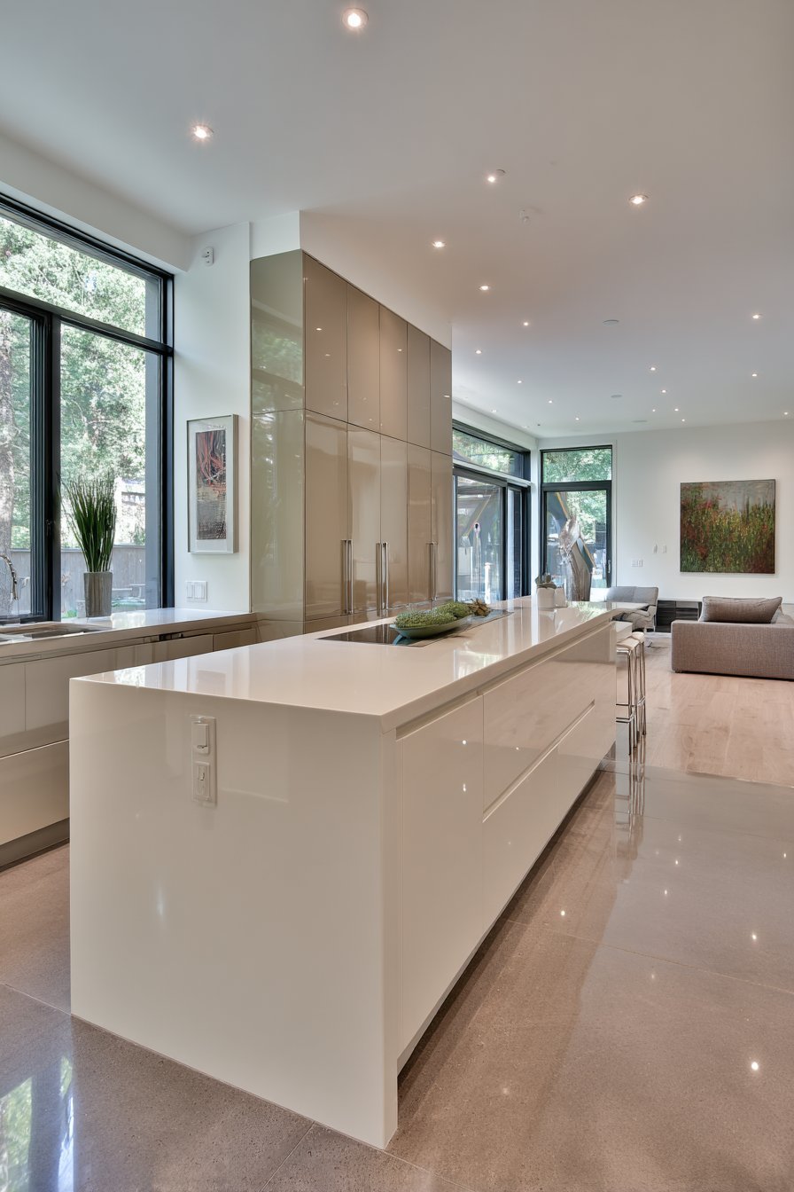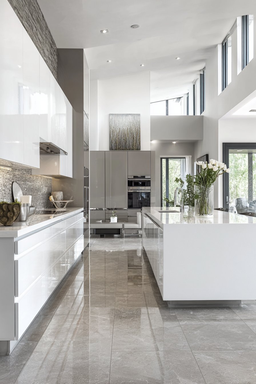 Perimeter cabinets in warm grey include floor-to-ceiling pantry wall. Integrated appliances create seamless storage surfaces throughout. Glossy white glass backsplash reflects light beautifully. The reflective surface amplifies natural illumination throughout the space.