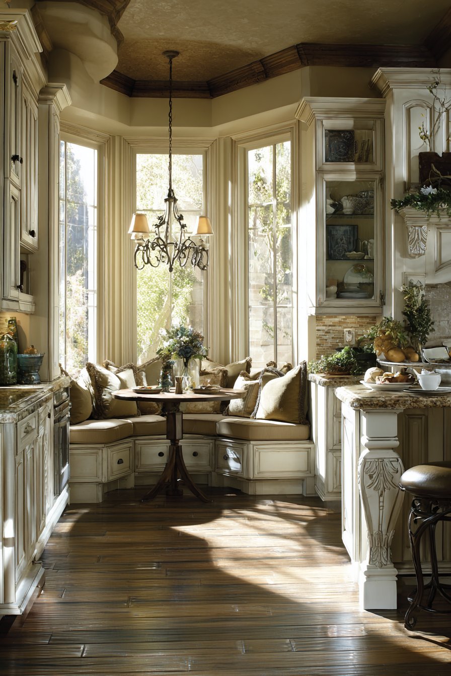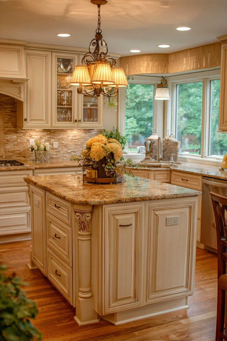A bronze chandelier with cream fabric shades hangs above the island. Natural light from bay windows creates warm, golden illumination. The cozy, welcoming atmosphere encourages family gathering naturally. Traditional elegance maintains grace within open layout design.