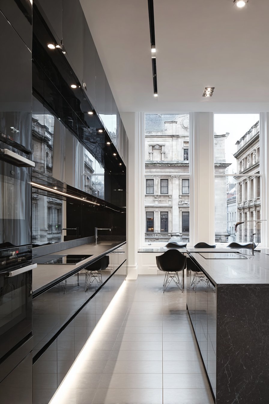 - Choose matte black cabinets for sophisticated depth