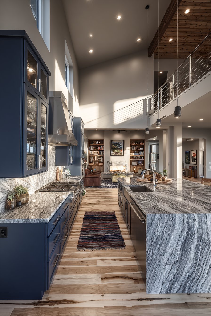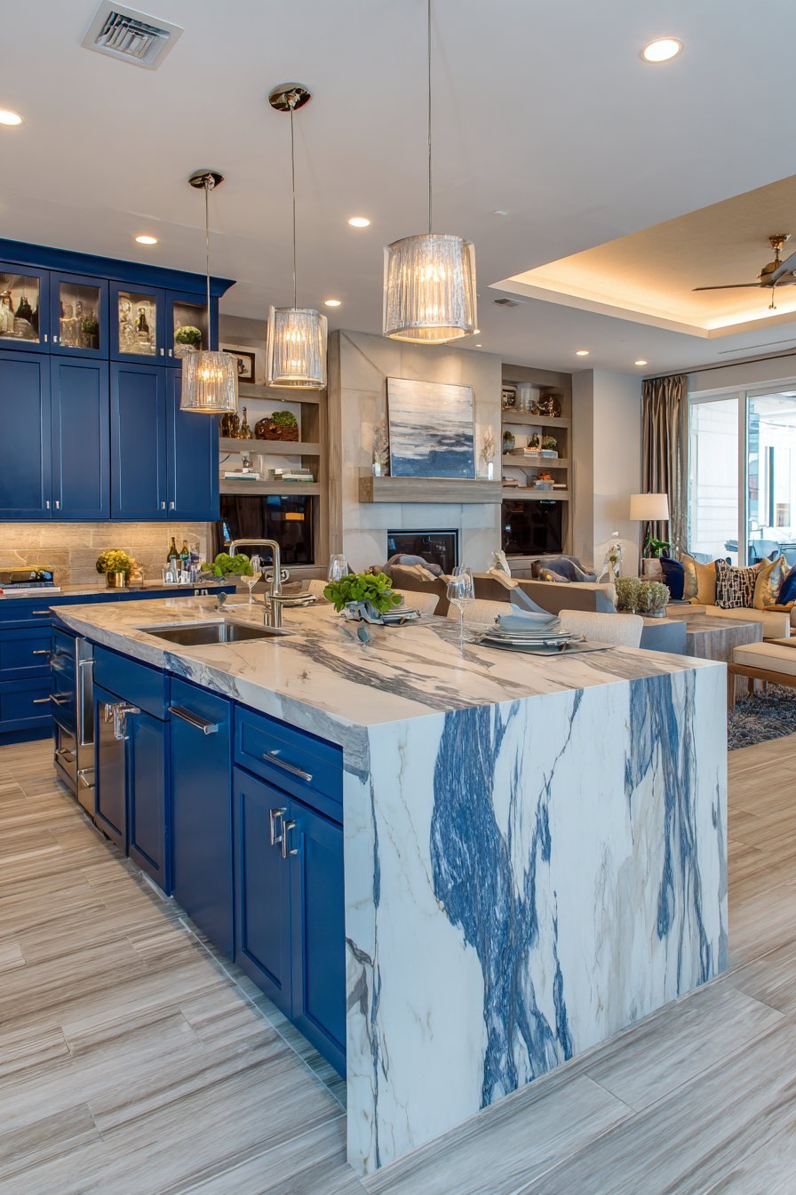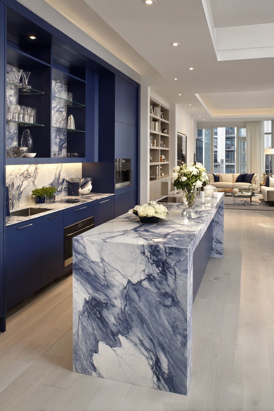 Navy blue lower cabinets create bold visual foundation. Upper glass-front cabinets display organized dishware elegantly. Marble-look quartz countertops with grey veining extend along perimeters. The stone appearance adds luxury without marble’s maintenance requirements.