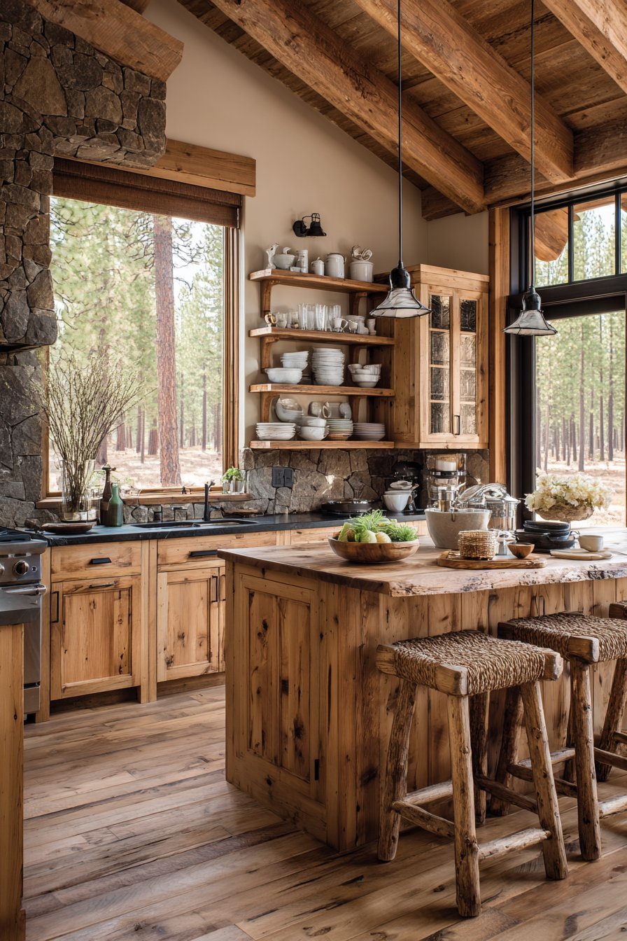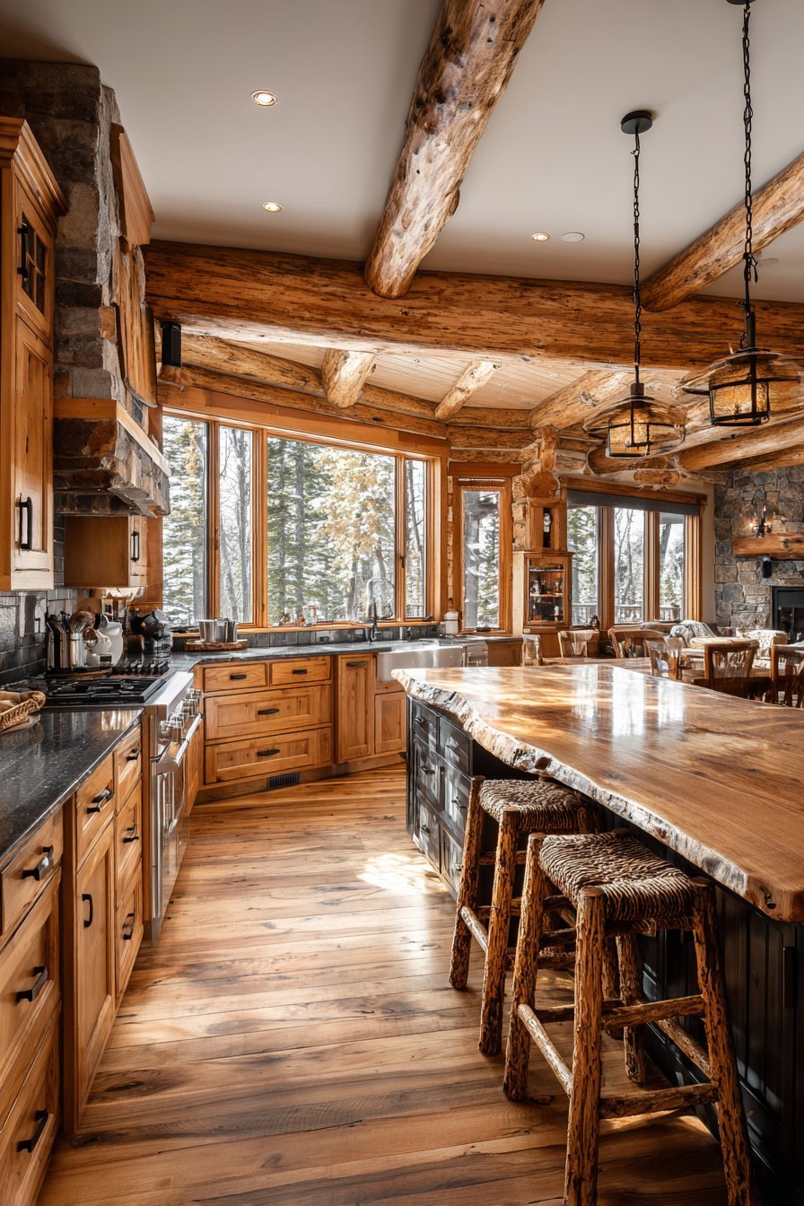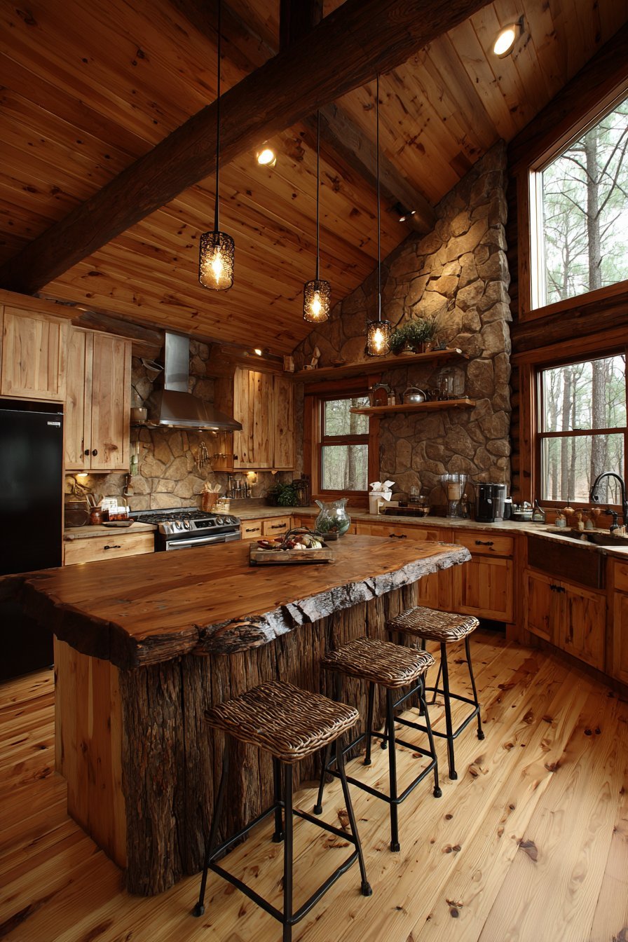 Rustic cabin aesthetic celebrates natural mountain materials. A log-style island features live-edge slab countertop authenticity. Matching log bar stools with woven twig backs add handcrafted charm. The organic materials create an immediate mountain lodge atmosphere.