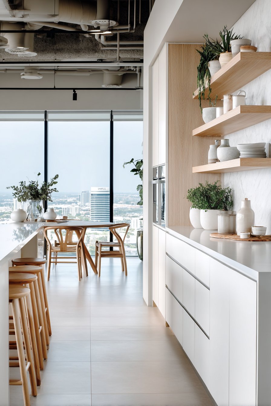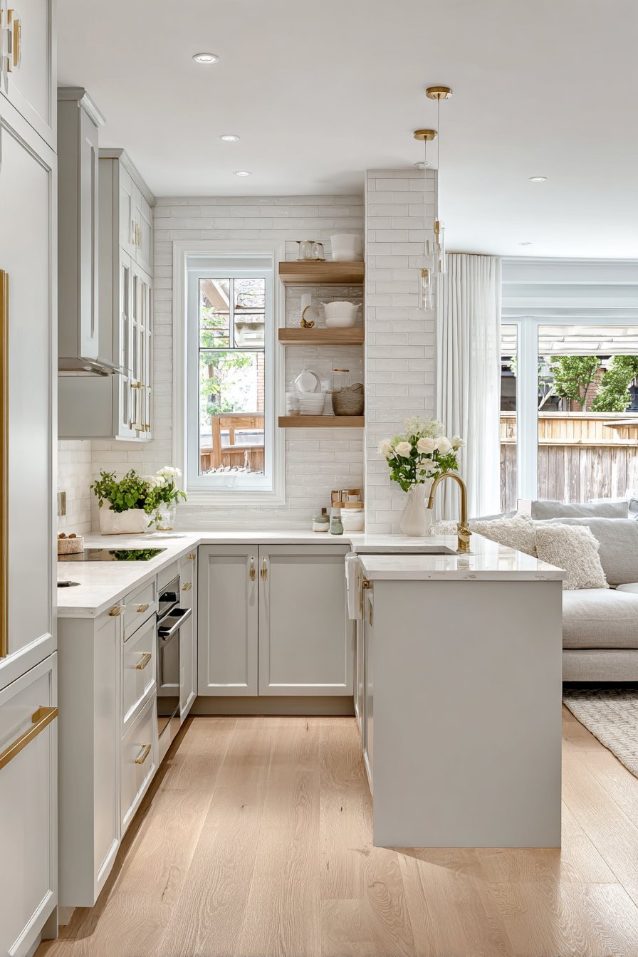 Flat-panel white cabinetry lines the perimeter walls with refined simplicity. Brushed gold hardware adds subtle luxury throughout. Open floating shelves display ceramic dishes and glassware with curated precision. The combination balances closed storage with decorative display opportunities beautifully.