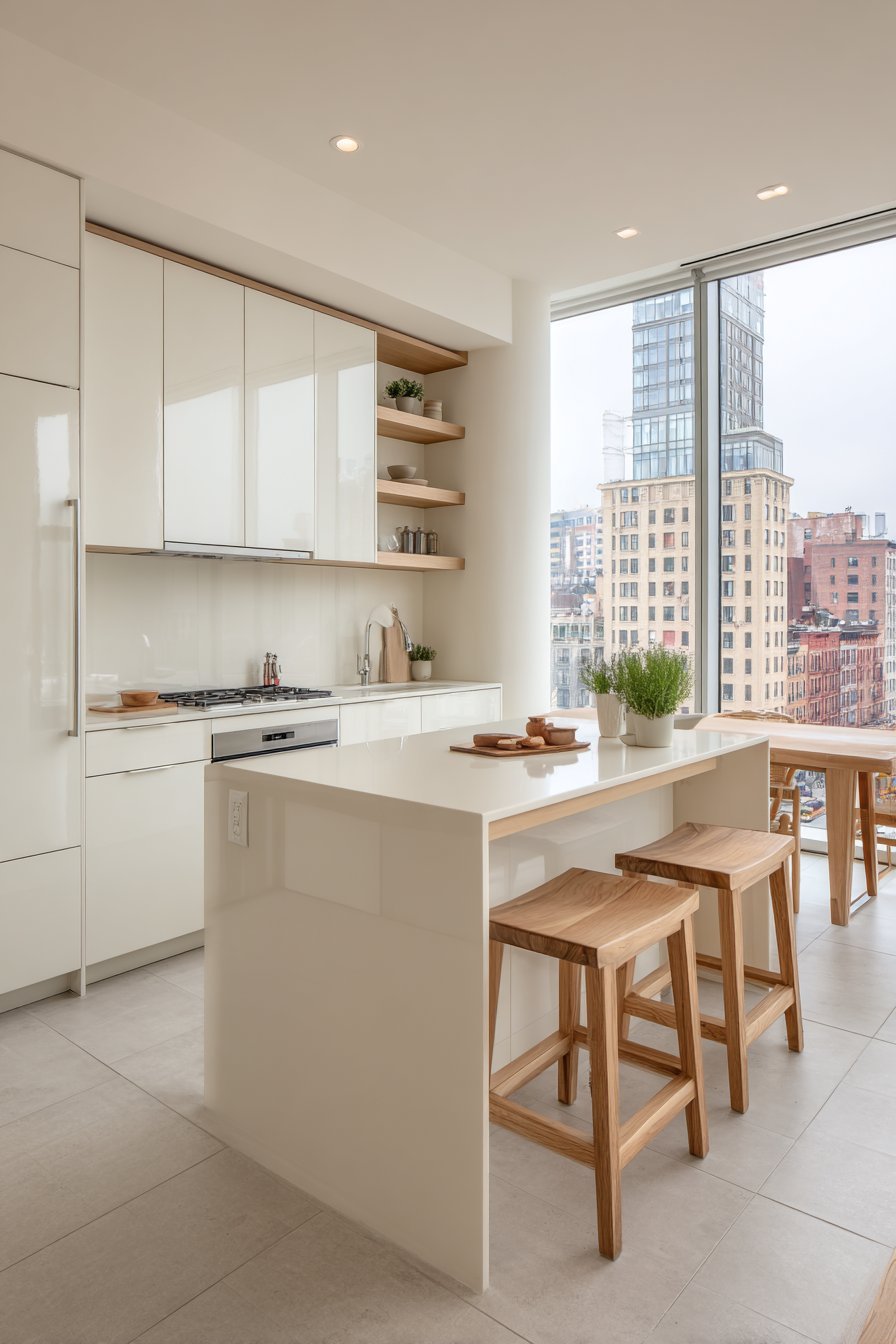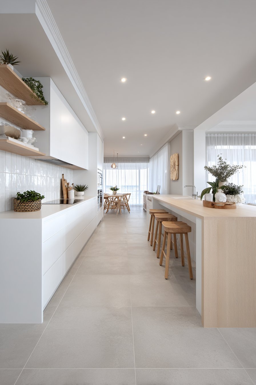 A slim waterfall island in pale oak offers additional workspace. Three simple wooden stools provide casual seating options. Open shelving along one wall displays minimal ceramic pieces. Small potted herbs add living greenery to the composition.