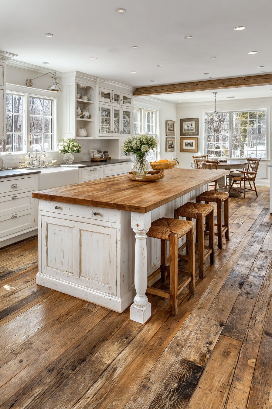 The kitchen flows naturally into a casual dining nook. A round pedestal table and Windsor chairs continue the farmhouse theme. Wide plank reclaimed wood flooring extends throughout both spaces. Natural wear patterns and color variations tell authentic stories.