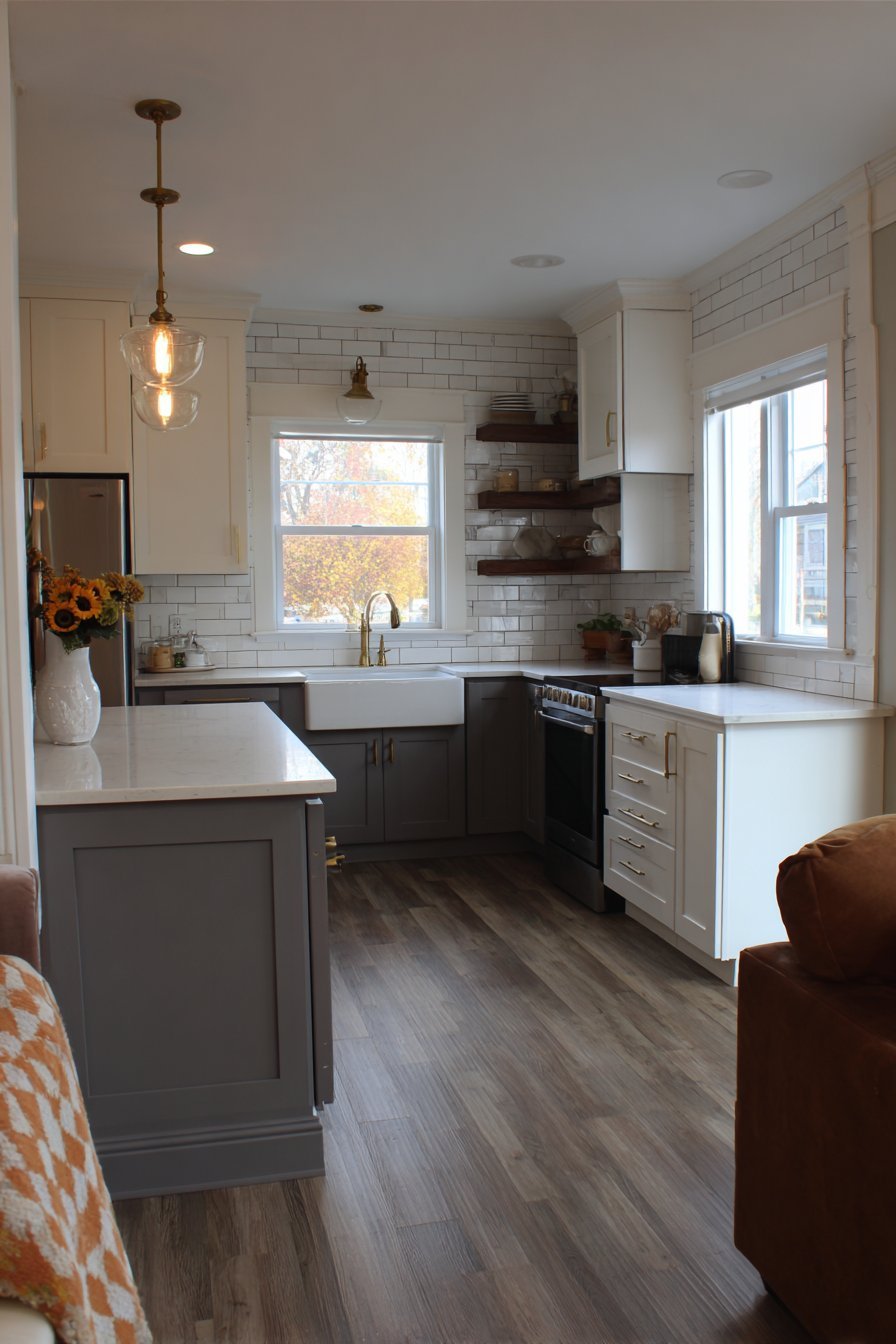 Two-tone cabinetry adds visual interest throughout the kitchen. Grey lower units ground the design with subtle color. White upper cabinets maintain brightness and openness. Brass hardware throughout provides warm metallic accents.