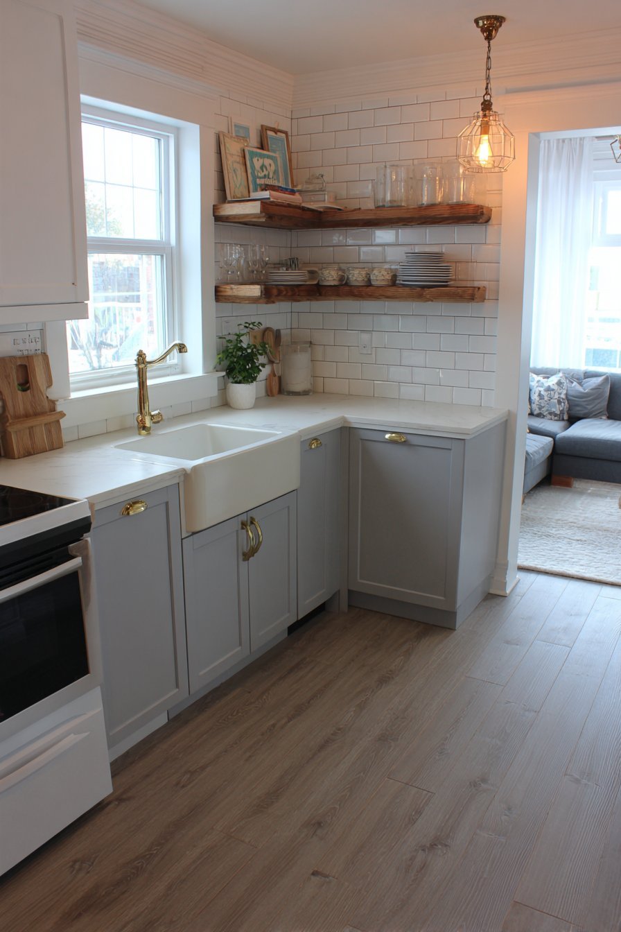 White shaker cabinets line the perimeter with classic simplicity. Aged brass hardware adds vintage warmth to painted surfaces. A deep farmhouse sink becomes a functional design statement. Open upper shelving displays vintage ceramic pieces and glass canisters.