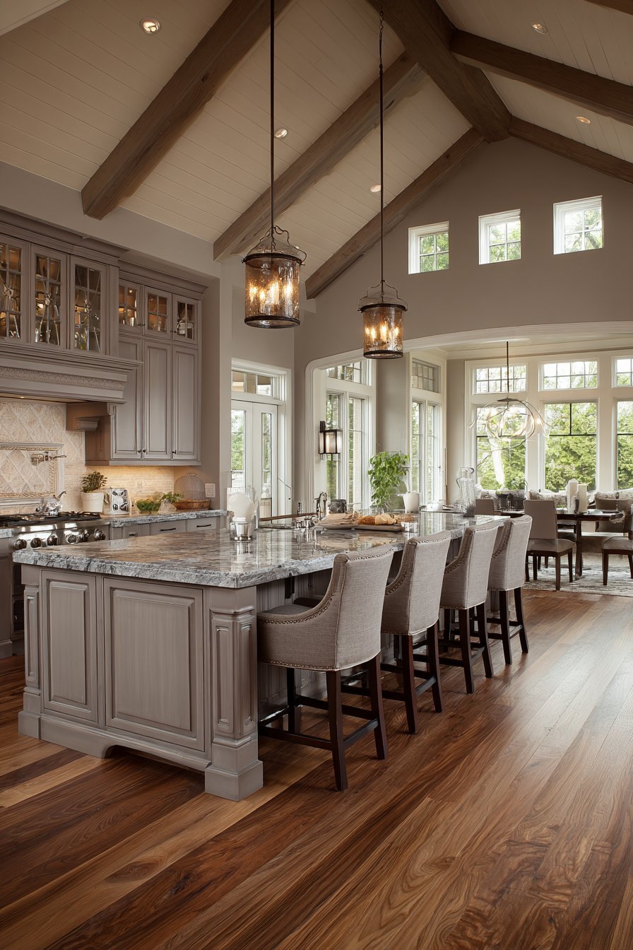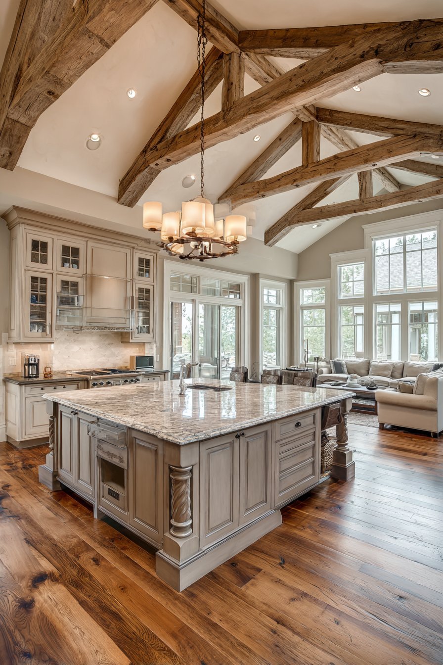 The kitchen connects openly to a great room beyond. Cathedral ceilings and exposed wood trusses create dramatic architecture. Medium walnut tone hardwood flooring flows throughout both spaces. The rich wood adds warmth and natural beauty.