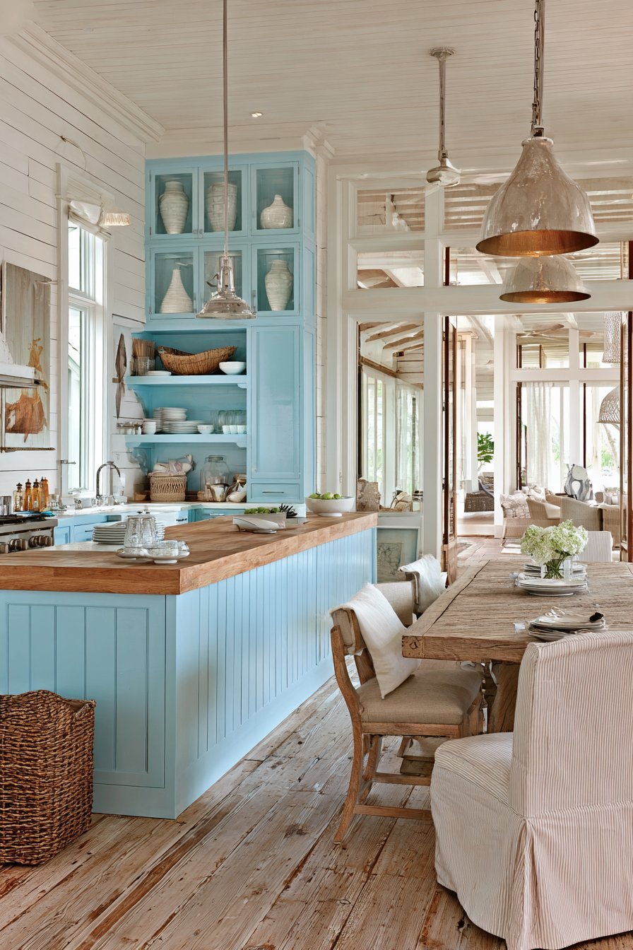 - Paint cabinets in soft blue-grey for coastal color