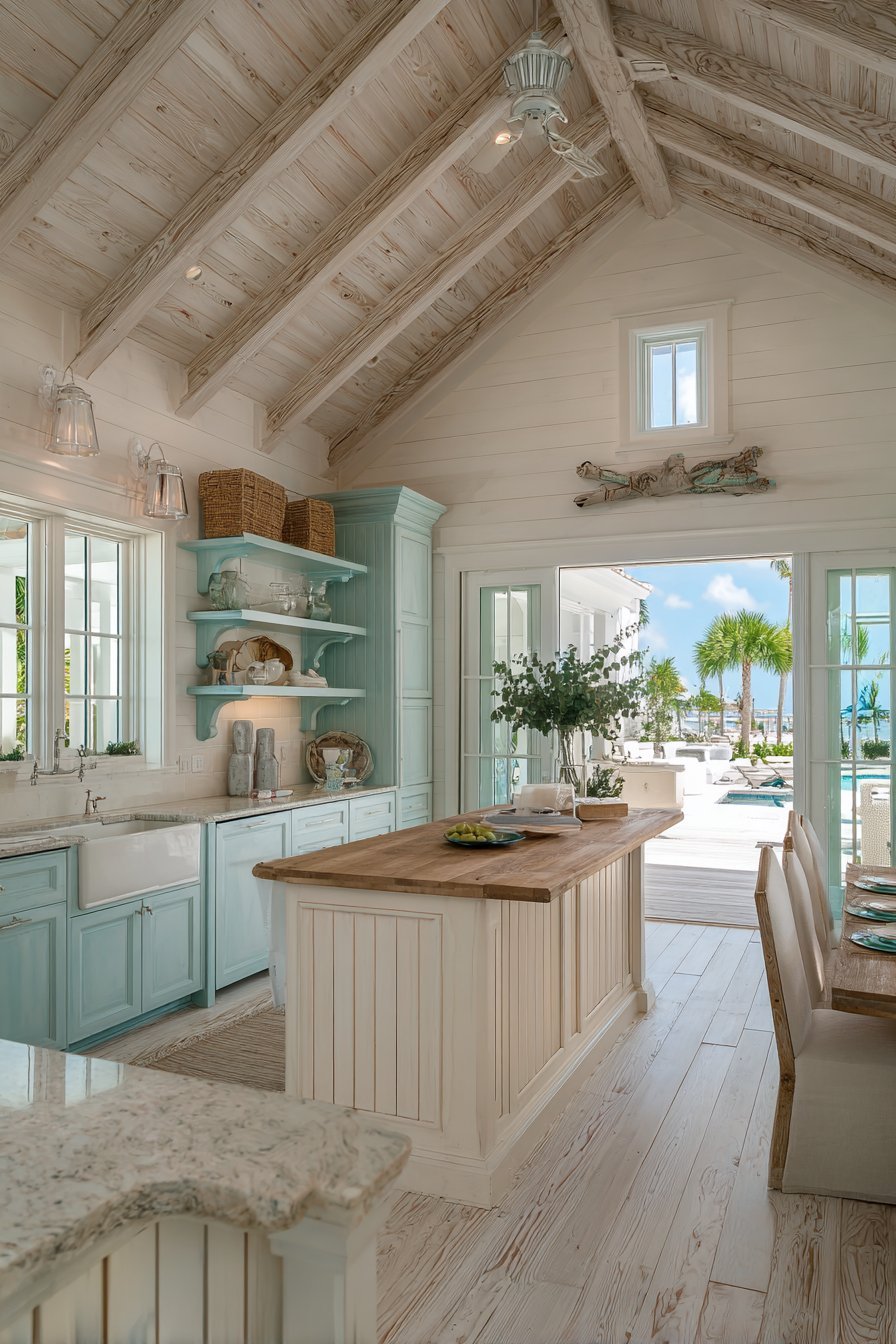 Coastal design elements infuse this kitchen with relaxed beauty. White beadboard covers the island base with cottage detail. Light blue-grey painted cabinets evoke ocean-side serenity. The color palette creates an immediate vacation-home atmosphere.