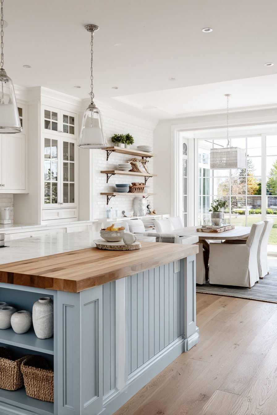 Butcher block countertop on the island provides warm contrast. White quartz perimeter counters maintain bright, clean surfaces. Open shelving with decorative brackets displays white ceramics. Woven baskets add natural texture and concealed storage.