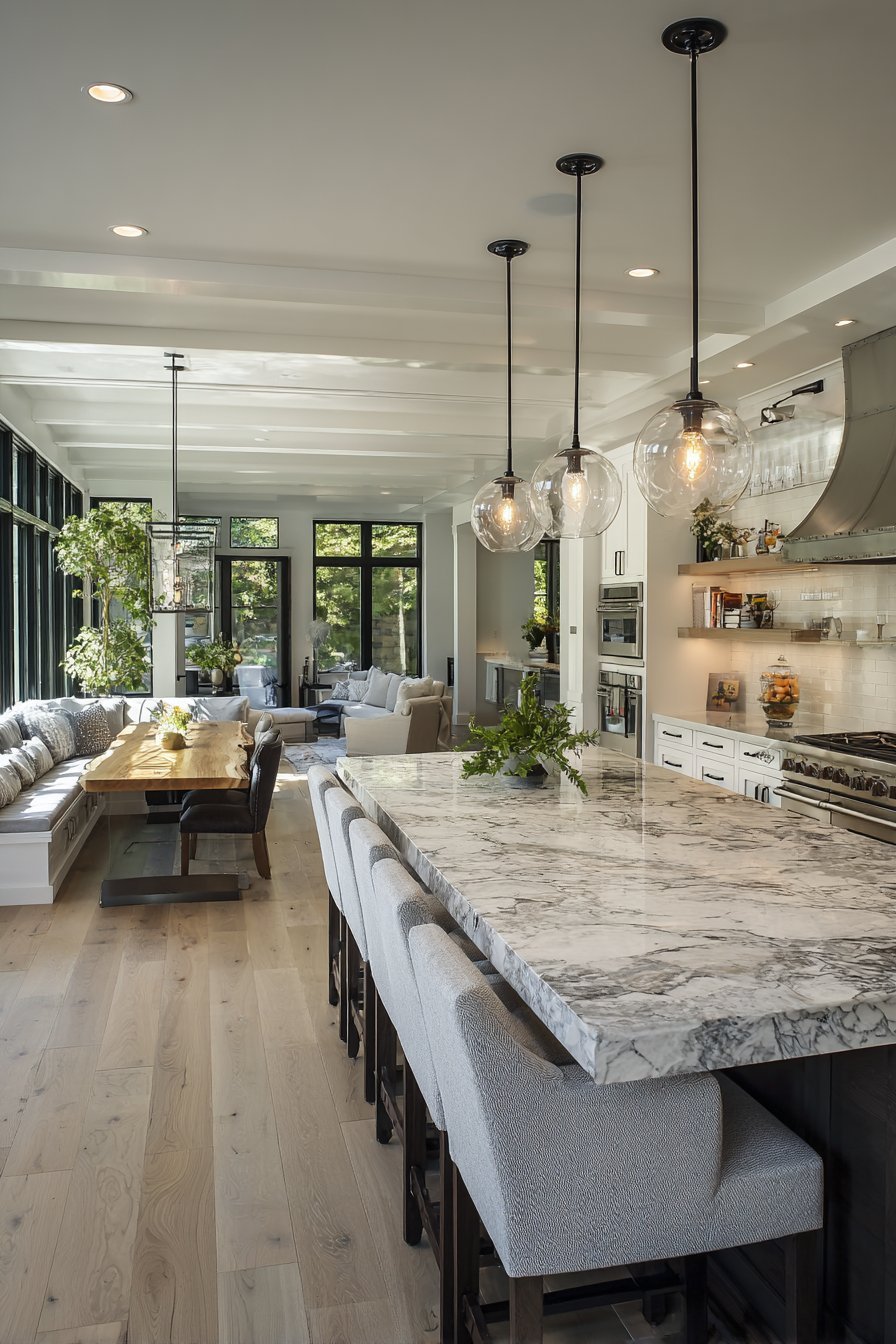 Pendant lights with clear glass globes suspend above the island. Natural oak hardwood flooring extends throughout both kitchen and dining zones. Large black-framed windows flood the space with abundant daylight. The minimal mullions maintain clean sight lines to outdoor views.
